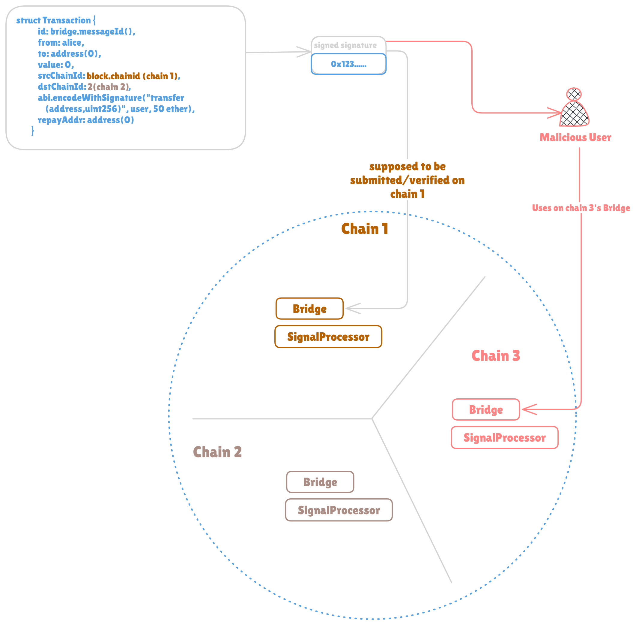 This attack is possible because the commented part of BridgeSignatureReplay.sendMsgPermit() where it fails to assign the transaction.srcChainId. Because of that, even though the signer signed the transaction struct which has specific srcChainId (let's say 31337, Or chain 1 in the diagram), it is possible to use that same signature on any other chain than 31337 (Or the chain for which the struct was originally created and signed).
